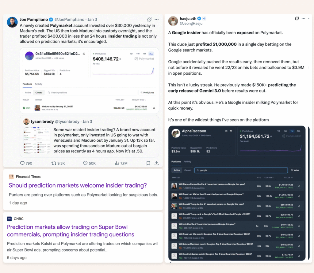 By widening the aperture to make almost anything tradable, prediction markets expand the sources of valuable inside information — often into contexts where the existence of any relevant promise is far less clear. This is especially true for permissionless or opinion markets, which often have no relevant company at all.
